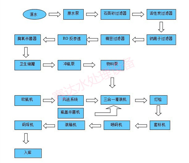 2000瓶/小時(shí)三合一瓶裝水生產(chǎn)線工藝流程: