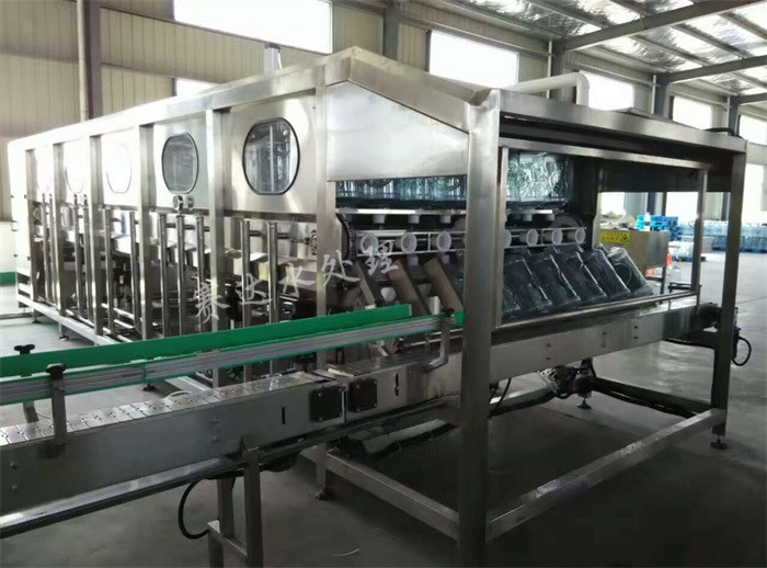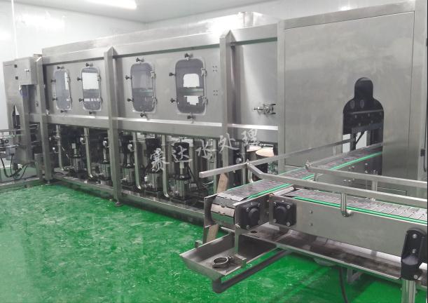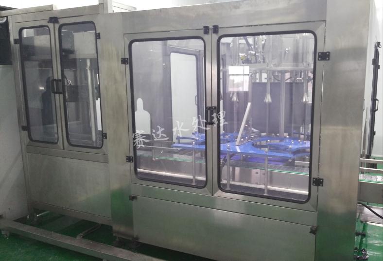 桶裝水灌裝機集消毒、沖洗、灌裝、封蓋于一體,其沖洗工位為:一道瀝干、兩道熱堿液噴洗、一道滴干、兩道自來水噴洗、兩道回用水噴洗、一道滴干四道消毒液噴洗、一道滴干、兩道成品水噴洗、一道滴干(沖洗工位可以根據客戶需求做14-20道),在此過程中,桶的外部也利用噴射頭進行了相應的噴洗,通過提升裝置,將所有噴射頭往上提升,深入空桶內部,對桶內部進行徹底的消毒、噴洗。通過自動下桶裝置將清洗后的空桶送入灌裝位置,并進行灌裝,過程中溢出的水將回流到純水箱,避免成品水的浪費。灌裝后的大桶由輸送鏈帶其依次進行掛蓋和封蓋。